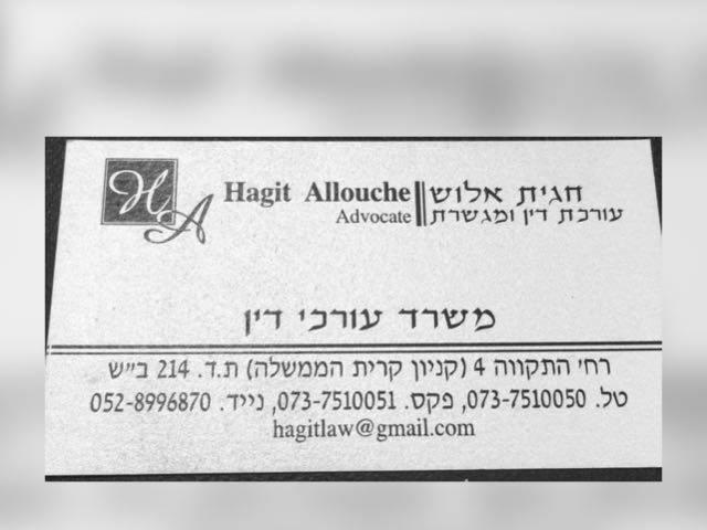 Hagit Allouche, Your attorney in and in South. You can get services , and . The service is discreet and professional manner. Advice on issues , , , or any other topic you can contact us by phone Or visit our office located in Louis Packard 42, . In addition, our firm specializes in handling , , and .